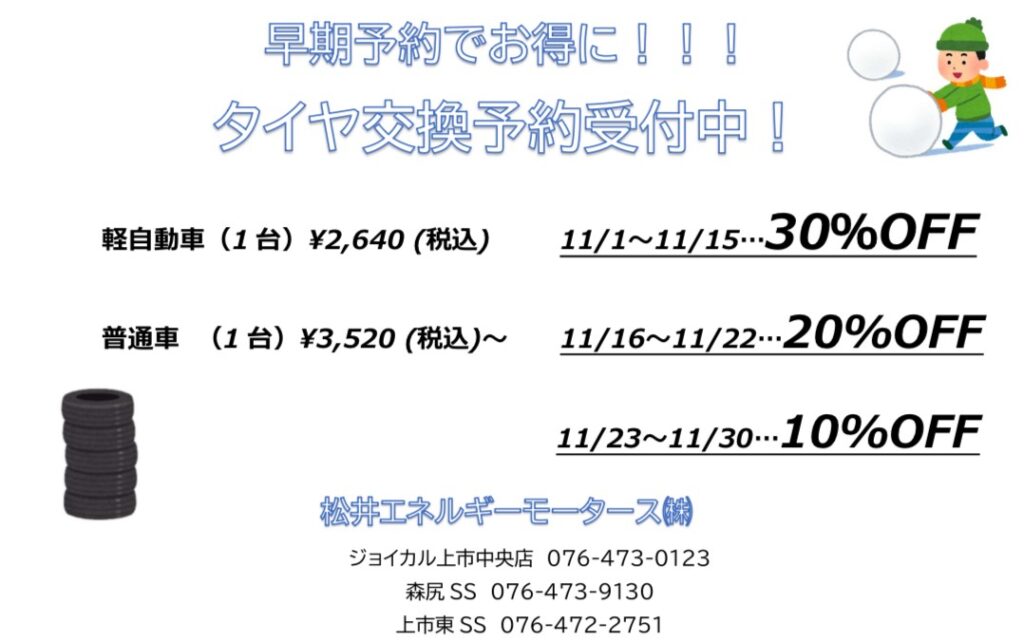 いつも松井エネルギーモータースをご利用いただきありがとうございます♪ 朝晩の冷え込みが強くなり、冬タイヤの交換時期が近づいてまいりました、 当社では今年もスタッドレスタイヤ交換の早期割引を行っております!